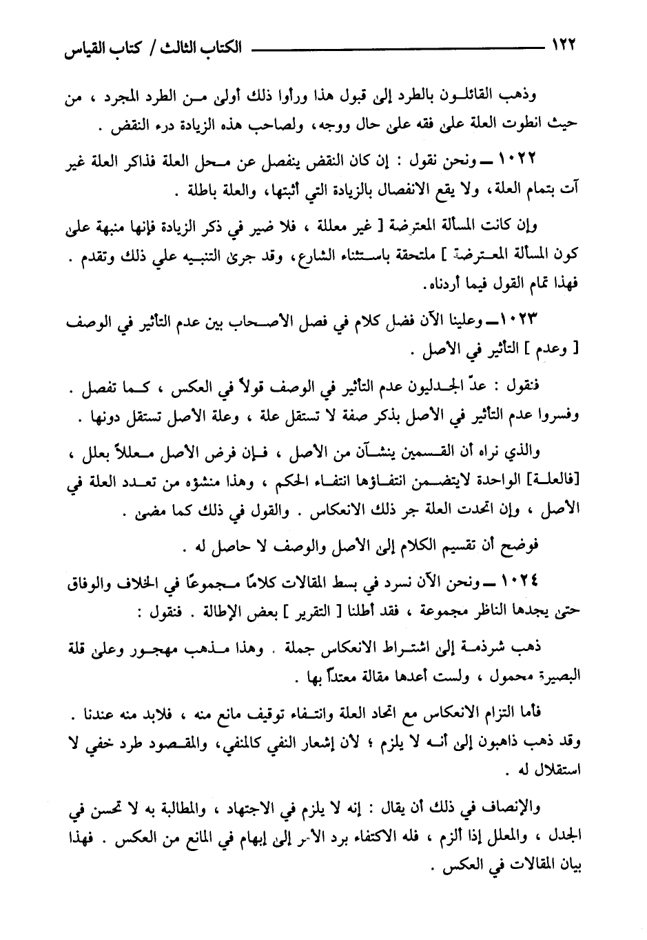 1022- ونحن نقول: إن كان النقض ينفصل عن محل العلة فذاكر العلة غير آت بتمام العلة ولا يقع الانفصال بالزيادة التي أثبتها والعلة باطلة.