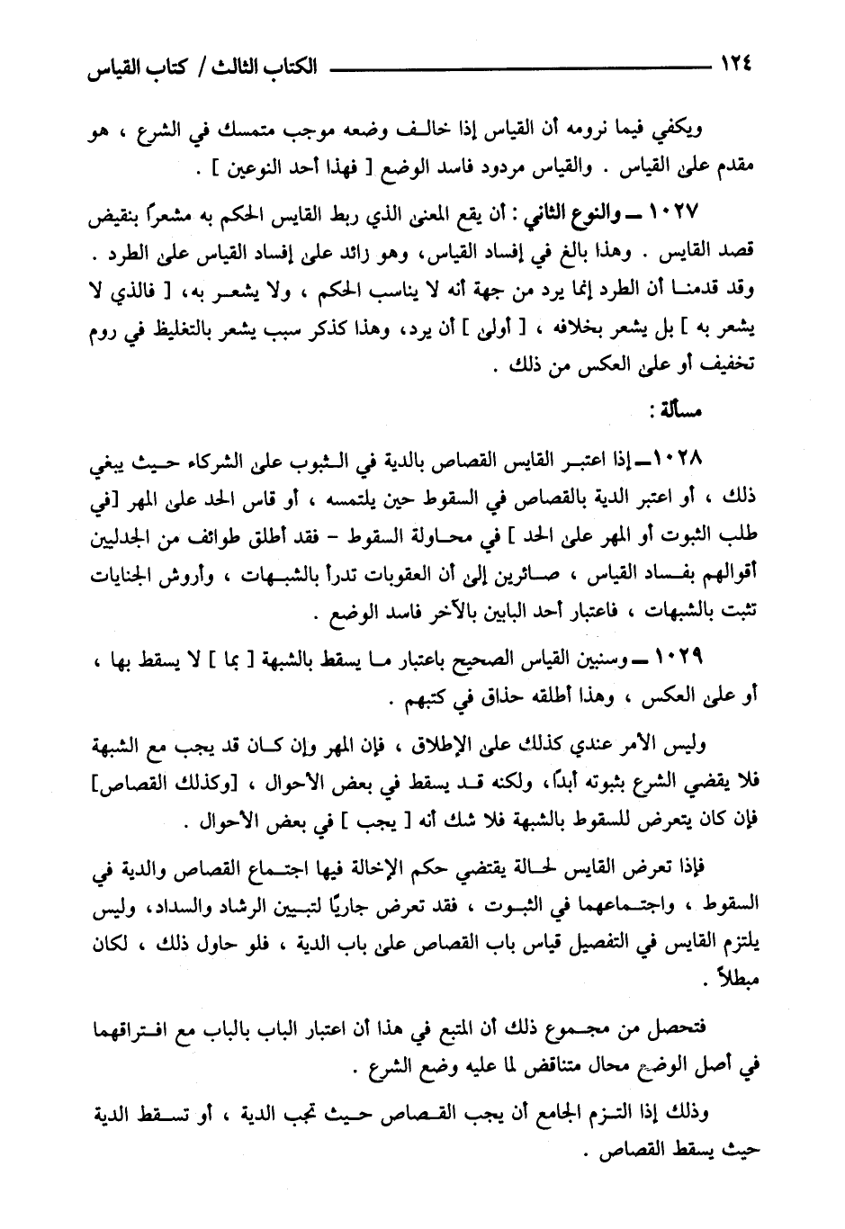 1029- وسنبين القياس الصحيح باعتبار ما يسقط بالشبهة [بما] لا يسقط بها أو على العكس وهذا أطلقه حذاق في كتبهم.