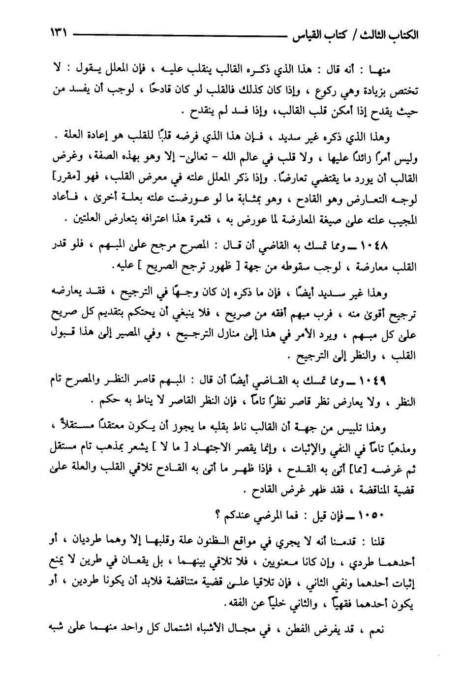 1048- ومما تمسك به القاضي أن قال: المصرح مرجح على المبهم فلو قدر القلب معارضة لوجب سقوطه من جهة [ظهور ترجح الصريح] عليه.