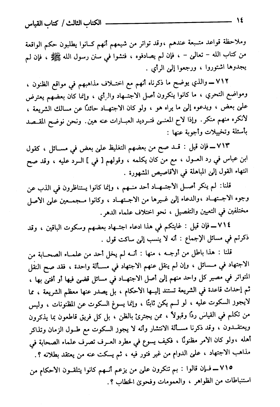 712- والذي يوضح ما ذكرناه أنهم مع اختلاف مذاهبهم في مواقع الظنون ومواضع التحري ما كانوا ينكرون أصل الاجتهاد والرأي وإنما كان بعضهم يعترض على بعض ويدعوه إلى ما يراه هو ولو كان الاجتهاد حائدا عن مسالك الشريعة لأنكره منهم منكر وإذا لاح المعنى فترديد العبارات عنه هين. ونحن نوضح المقصد بأسئلة وتخييلات وأجوبة عنها: