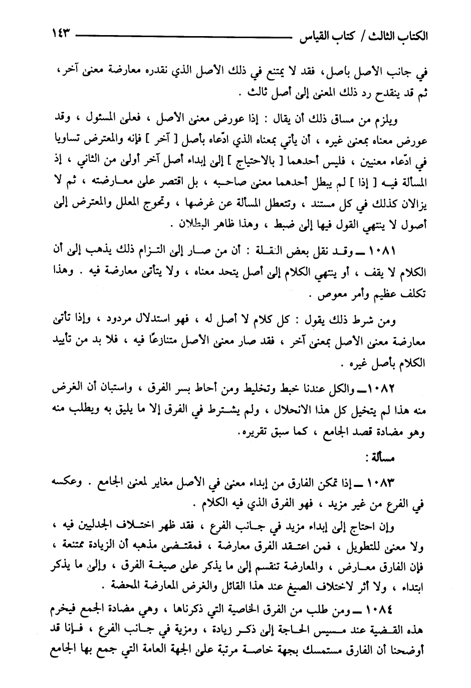1083- وإذا تمكن الفارق من إبداء معنى في الأصل مغاير لمعنى الجامع وعكسه في الفرع من غير مزيد فهو الفرق الذي فيه الكلام.