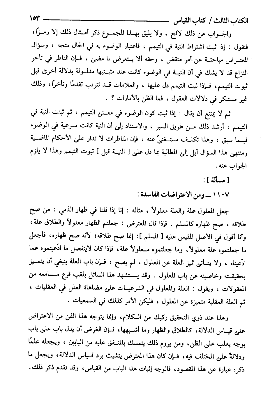 والجواب عن ذلك لائح ولا يليق بهذا المجموع ذكر أمثال ذلك إلا رمزا فنقول: إذا ثبت اشتراط النية في التيمم فاعتبار الوضوء به في الحال متجه وسؤال المعترض مباحثة عن أمر منقض وحقه ألا يتعرض لما مضى فإن الناظر في تأخر النزاع قد لا يشك في أن النية في الوضوء كانت عند مثبتيها مدلولة بدلالة أخرى قبل ثبوت التيمم فإذا ثبت التيمم دل عليها والعلامات قد تترتب تقدما وتأخرا وذلك غير مستنكر في دلالات العقول فما الظن بالأمارات؟
