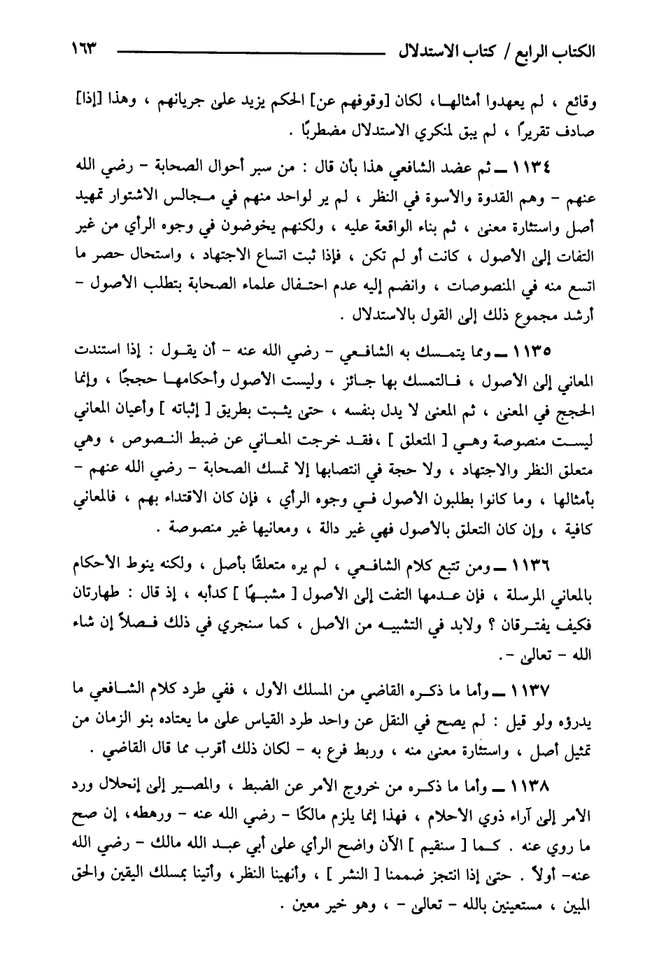 1135- ومما يتمسك به الشافعي رضي الله عنه أن يقول: إذا استندت المعاني إلى الأصول فالتمسك بها جائز وليست الأصول وأحكامها حججا وإنما الحجج في المعنى ثم المعنى لا يدل بنفسه حتى يثبت بطريق [إثباته] وأعيان المعاني ليست منصوصة وهي [المتعلق] فقد خرجت المعاني عن ضبط النصوص وهي متعلق النظر والاجتهاد ولا حجة في انتصابها إلا تمسك الصحابة رضي الله عنهم بأمثالها وما كانوا يطلبون الأصول في وجوه الرأي فإن كان الاقتداء بهم فالمعاني كافية وإن كان التعلق بالأصول فهي غير دالة ومعانيها غير منصوصة.