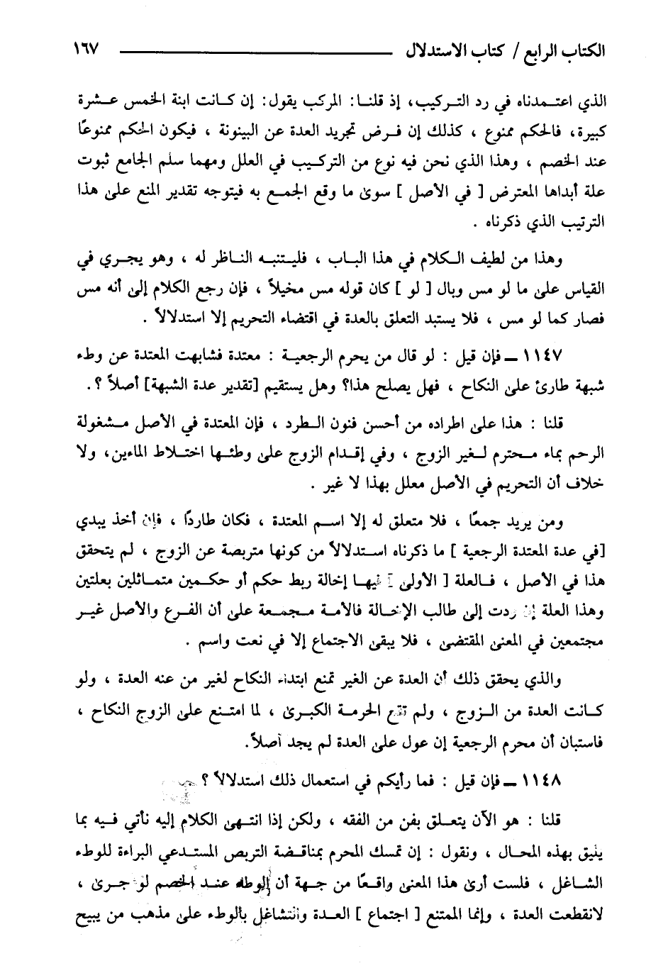 1147- فإن قيل: لو قال من يحرم الرجعية معتدة فشابهت المعتدة عن وطء شبهة طارئ على النكاح فهل يصلح هذا وهل يستقيم [تقدير عدة الشبهة] أصلا؟.