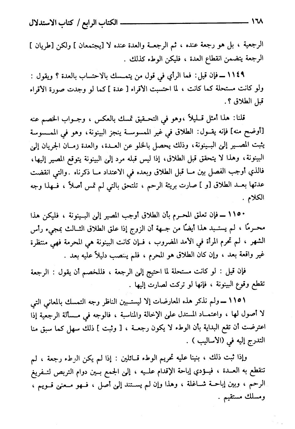 1149- فإن قيل فما الرأي في قول من يتمسك بالاحتساب بالعدة؟ ويقول: ولو كانت مستحلة كما كانت لما احتسبت الأقراء [عدة] كما لو وجدت صورة الأقراء قبل الطلاق؟