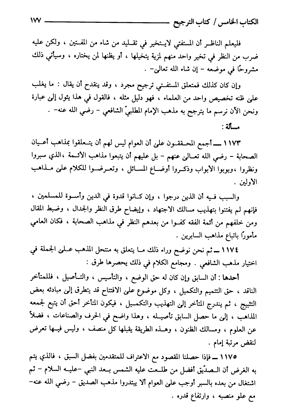 1173- أجمع المحققون على أن العوام ليس لهم أن يتعلقوا بمذاهب أعيان الصحابة رضي الله تعالى عنهم بل عليهم أن يتبعوا مذاهب الأئمة الذين سبروا ونظروا وبوبوا الأبواب وذكروا أوضاع المسائل وتعرضوا للكلام على مذاهب الأولين.