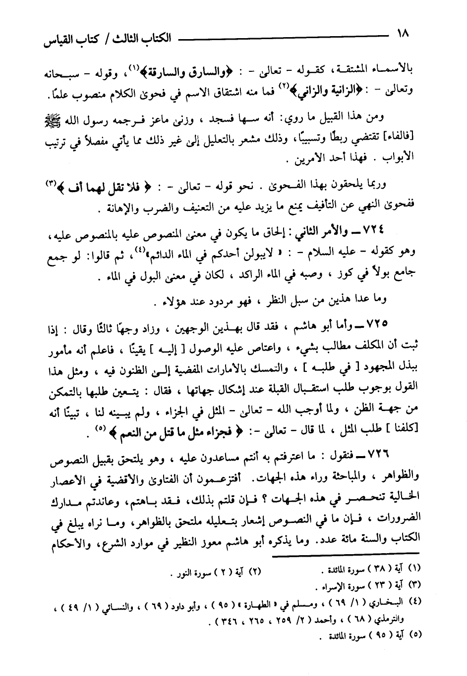 724- والأمر الثاني: إلحاق ما يكون في معنى المنصوص عليه بالمنصوص عليه وهو كقوله عليه السلام: "لا يبولن أحدكم في الماء الدائم" 4 ثم قالوا لو جمع جامع بولا في كوز وصبه في الماء الراكد لكان في معنى البول في الماء.
