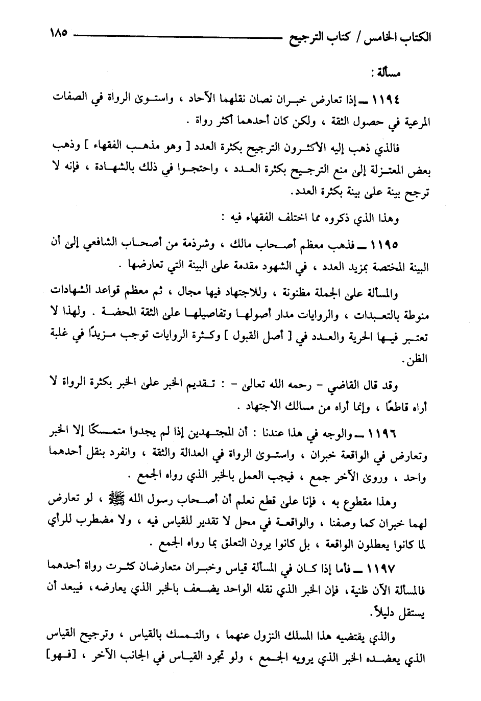 1194- إذا تعارض خبران نصان نقلهما الآحاد واستوى الرواة في الصفات المرعية في حصول الثقة ولكن كان أحدهما أكثر رواة.