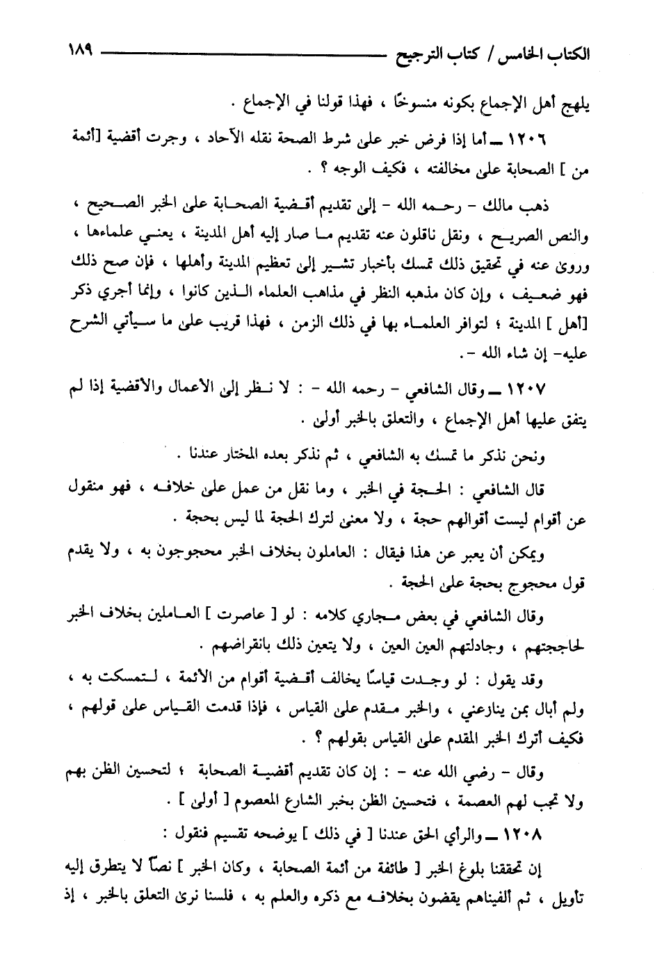 1207- وقال الشافعي رحمه الله: لا نظر إلى الأعمال والأقضية إذا لم يتفق عليها أهل الإجماع والتعلق بالخبر أولى.