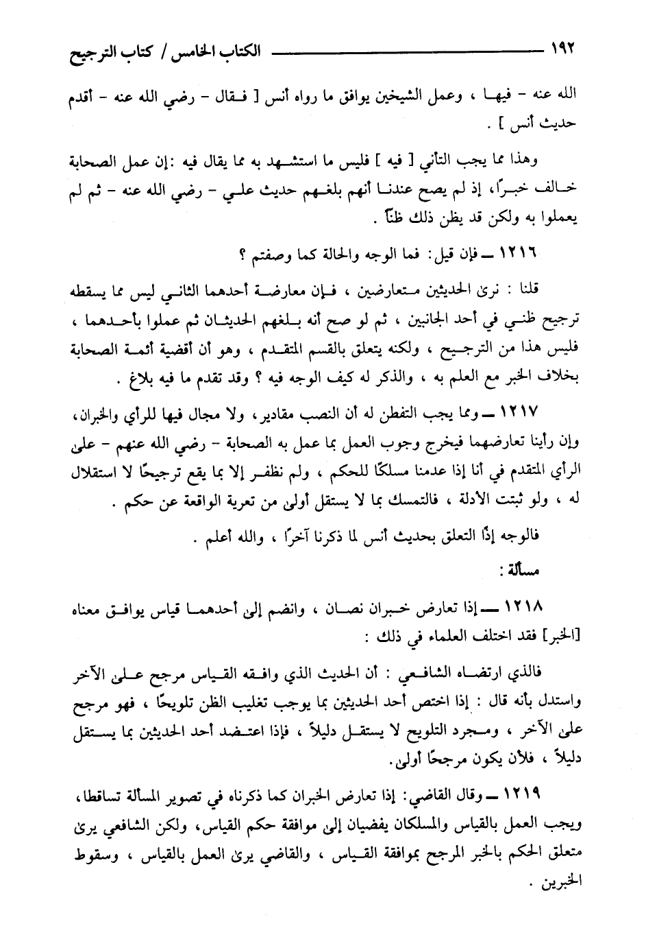 1217- ومما يجب التفطن له أن النصب مقادير ولا مجال فيها للرأي والخبران وإن رأينا تعارضهما فيخرج وجوب العمل بما عمل به الصحابة رضي الله عنهم على الرأي المتقدم في أنا إذا عدمنا مسلكا للحكم ولم نظفر إلا بما يقع ترجيحا لا استقلال له ولو ثبتت الأدلة فالتمسك بما لا يستقل أولى من تعريه الواقعة عن حكم.