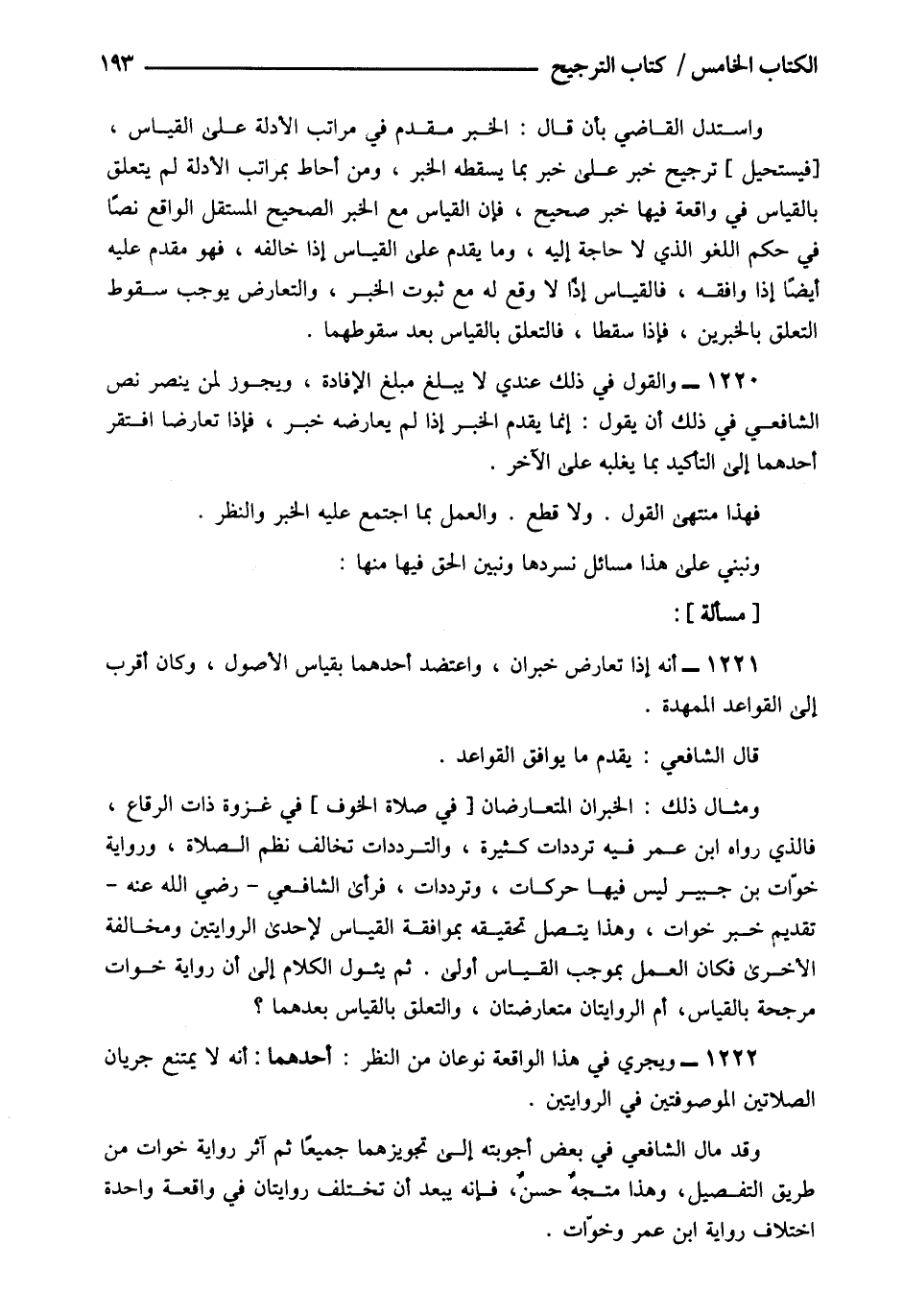 1221- أنه إذا تعارض خبران واعتضد أحدهما بقياس الأصول وكان أقرب إلى القواعد الممهدة.