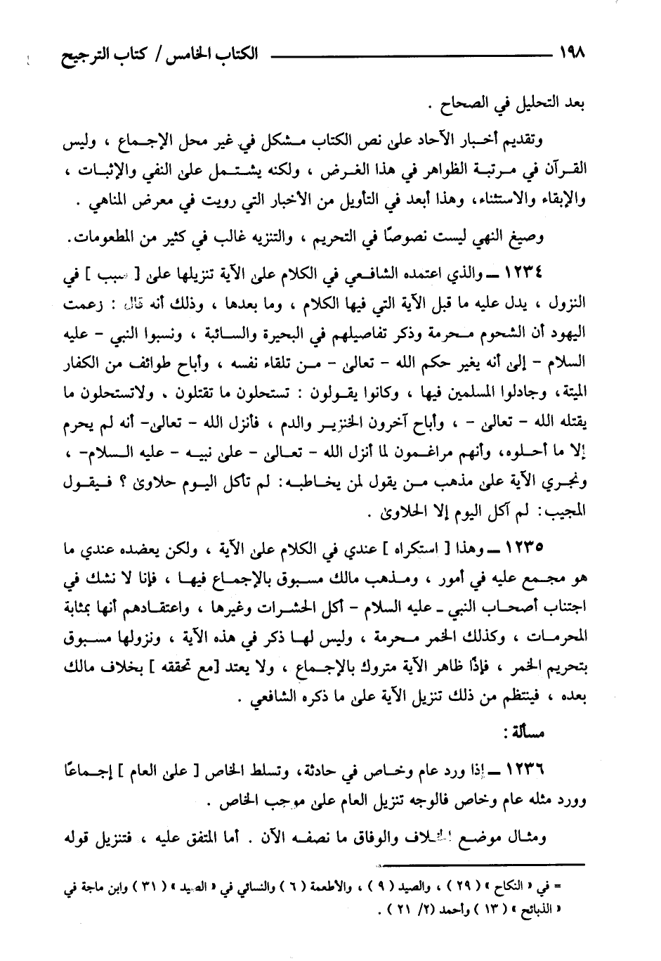 1235- وهذا [استكراه] عندي في الكلام على الآية ولكن يعضده عندي ما هو مجمع عليه في أمور ومذهب مالك مسبوق بالإجماع فيها فإنا لا نشك في اجتناب أصحاب النبي عليه السلام أكل الحشرات وغيرها واعتقادهم أنها بمثابة المحرمات وكذلك الخمر محرمة وليس لها ذكر في هذه الآية ونزولها مسبوق يتحريم الخمر فإذا ظاهر الآية متروك بالإجماع ولا يعتد [مع تحققه] بخلاف مالك بعده فينتظم من ذلك الآية على ما ذكره الشافعي.