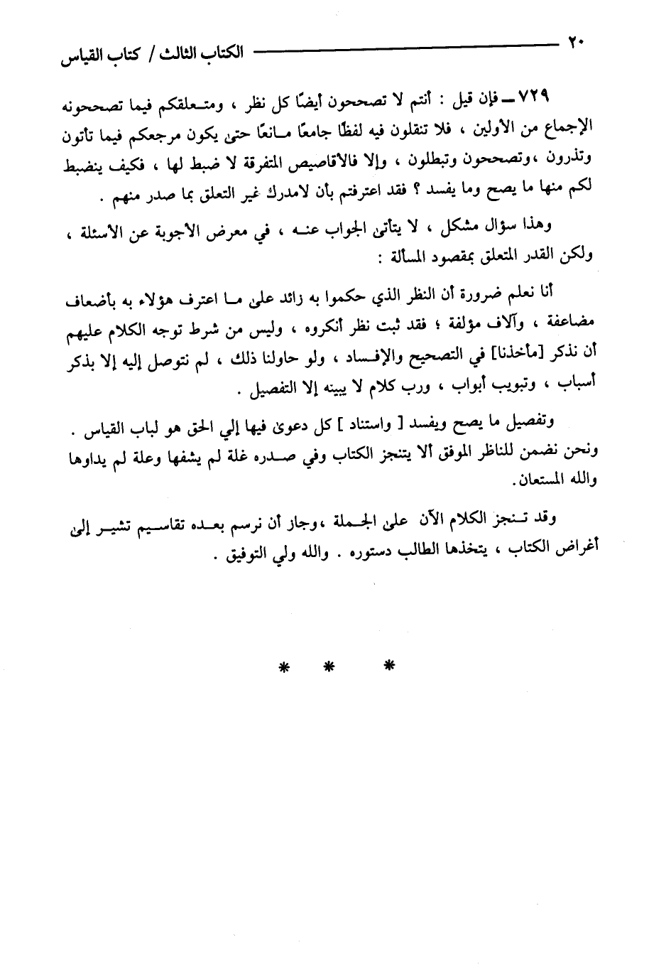 وتفصيل ما يصح ويفسد [واستناد] كل دعوى فيها إلى الحق هو لباب القياس ونحن نضمن للناظر الموفق إلا يتنجز الكتاب وفي صدره غلة لم يشفها وعلة لم يداوها والله المستعان.