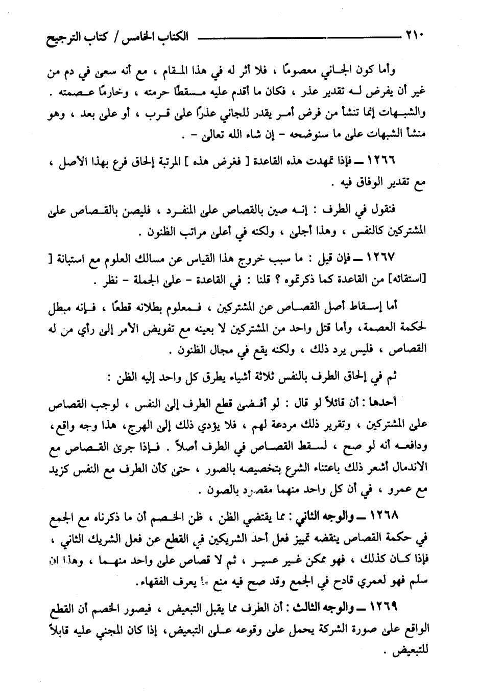 1269- والوجه الثالث: أن الطرف مما يقبل التبعيض فيصور الخصم أن القطع الواقع على صورة الشركة يحمل على وقوعه على التبعيض إذا كان المجني عليه قابلا للتبعيض.