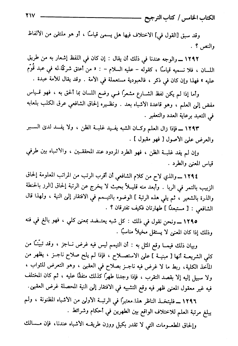 1296- فليتخذ الناظر هذا معتبرا في الرتبة الأولى من الأشباه المظنونة ولم يبلغ مرتبة العلم للاختلاف الواقع بين الطهرين في أحكام وشرائط.