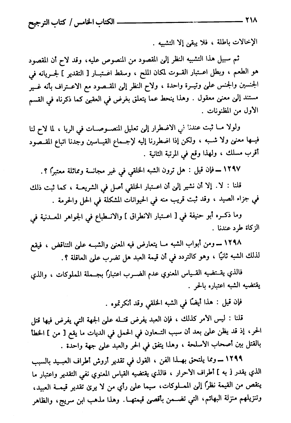 1298- ومن أبواب الشبه ما يتعارض فيه المعنى والشبه على التناقض فيقع لذلك الشبه ثانيا وهو كالتردد في أن قيمة العبد هل تضرب على العاقلة؟