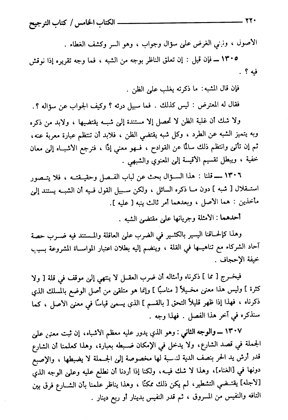 1307- والوجه الثاني: وهو الذي يدور عليه معظم الأشباه إن ثبت معنى على الجملة في قصد الشارع ولا يدخل في الإمكان ضبطه بعبارة وهذا كعلمنا أن الشارع قدر أرش يد الحر بنصف الدية لنسبة لها مخصوصة إلى الجملة لا يضبطها والإصبع دونها في [الغناء] وهذا لا شك فيه ولكنا إذا أردنا أن نطلع عليه وعلى الوجه الذي لأجله يقتضي التشطير لم يكن ذلك ممكنا وهذا يناظر علمنا بأن الشارع فرق بين التافه والنفيس من المسروق ثم قدر النفيس بدينار أو ربع دينار.