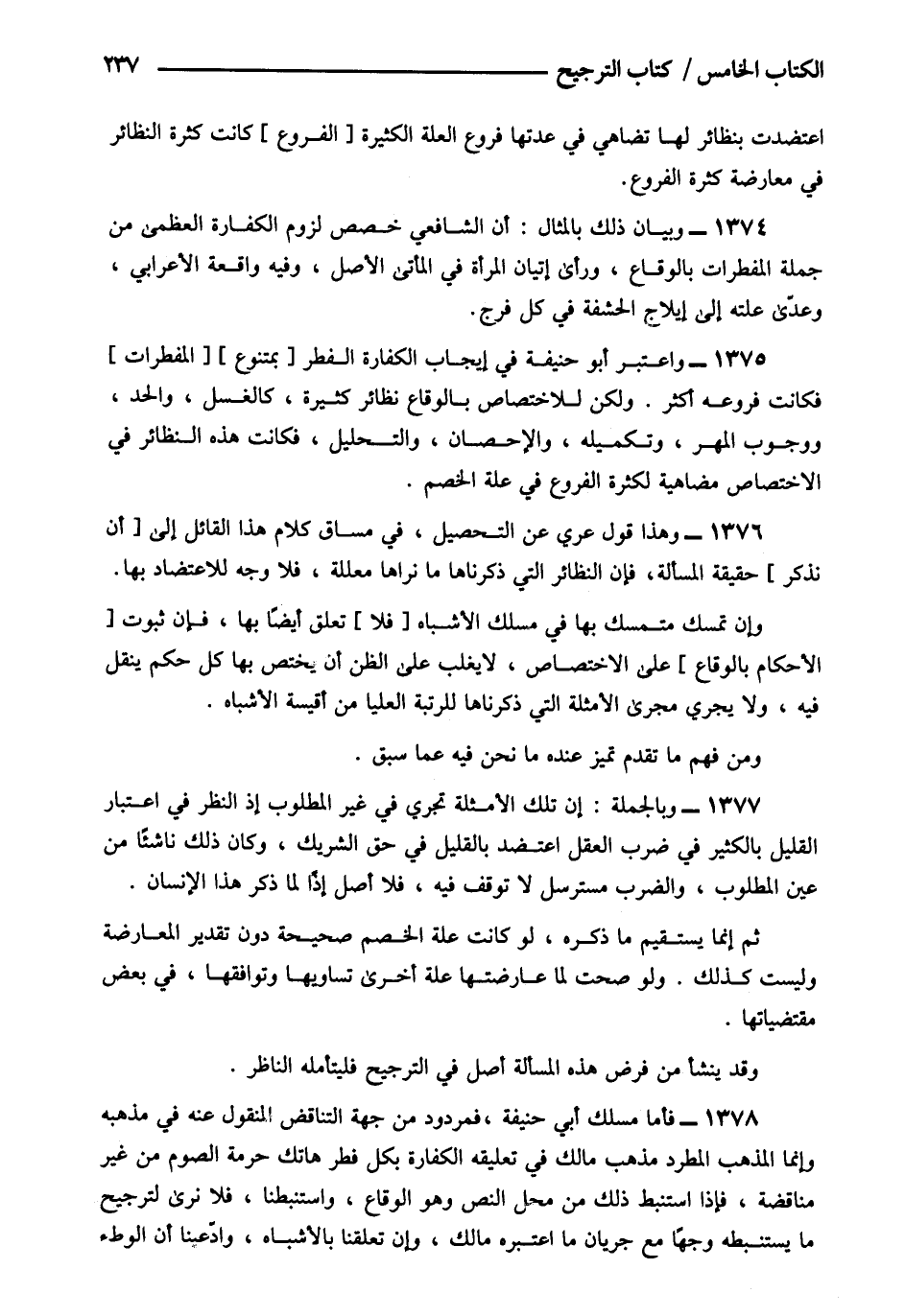 1378- فأما مسلك أبي حنيفة فمردود من جهة التناقض المنقول عنه في مذهبه وإنما المذهب المطرد مذهب مالك في تعليقه الكفارة بكل فطر هاتك حرمة الصوم من غير مناقضة فإذا استنبط ذلك من محل النص وهو الوقاع واستنبطناه فلا نرى لترجيح ما يستنبطه وجها مع جريان ما اعتبره مالك وإن تعلقنا بالأشباه وادعينا أن الوطء.