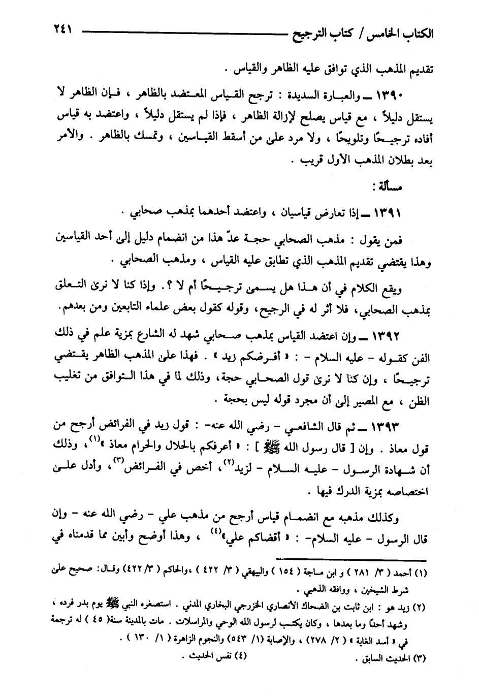 1393- ثم قال الشافعي رضي الله عنه قول زيد في الفرائض أرجح من قول معاذ وإن [قال رسول الله صلى الله عليه وسلم] : "أعرفكم بالحلال والحرام معاذ" 1 وذلك أن شهادة الرسول عليه السلام لزيد2 أخص في الفرائض3 وأدل على اختصاصه بمزية الدرك فيها.