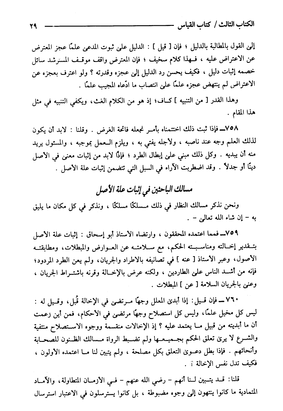758- فإذا ثبت ذلك اختتمناه بأمر نجعله فاتحة الغرض وقلنا لا بد أن يكون لذلك العلم وجه عند ناصبه ولأجله يفتي به ويلزم العمل بموجبه والمسئول يريد منه أن يبديه وكل ذلك مبني على أبطال الطرد فإذا لا بد من إثبات معنى في الأصل دينا أو جدلا وقد اضطربت الاراء في السبل التي تتضمن إثبات علة الأصل.