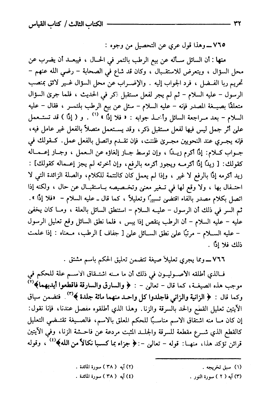 فالذي أطلقه الأصوليون في ذلك أن ما منه اشتقاق الاسم علة للحكم في موجب هذه الصيغة كما قال تعالى: {وَالسَّارِقُ وَالسَّارِقَةُ} 2 فاقطعوا أيديهما وكما قال: {لزَّانِيَةُ وَالزَّانِي فَاجْلِدُوا كُلَّ وَاحِدٍ مِنْهُمَا مِائَةَ جَلْدَةٍ} 3 فتضمن سياق الآيتين تعليل القطع والحد بالسرقة والزنا.