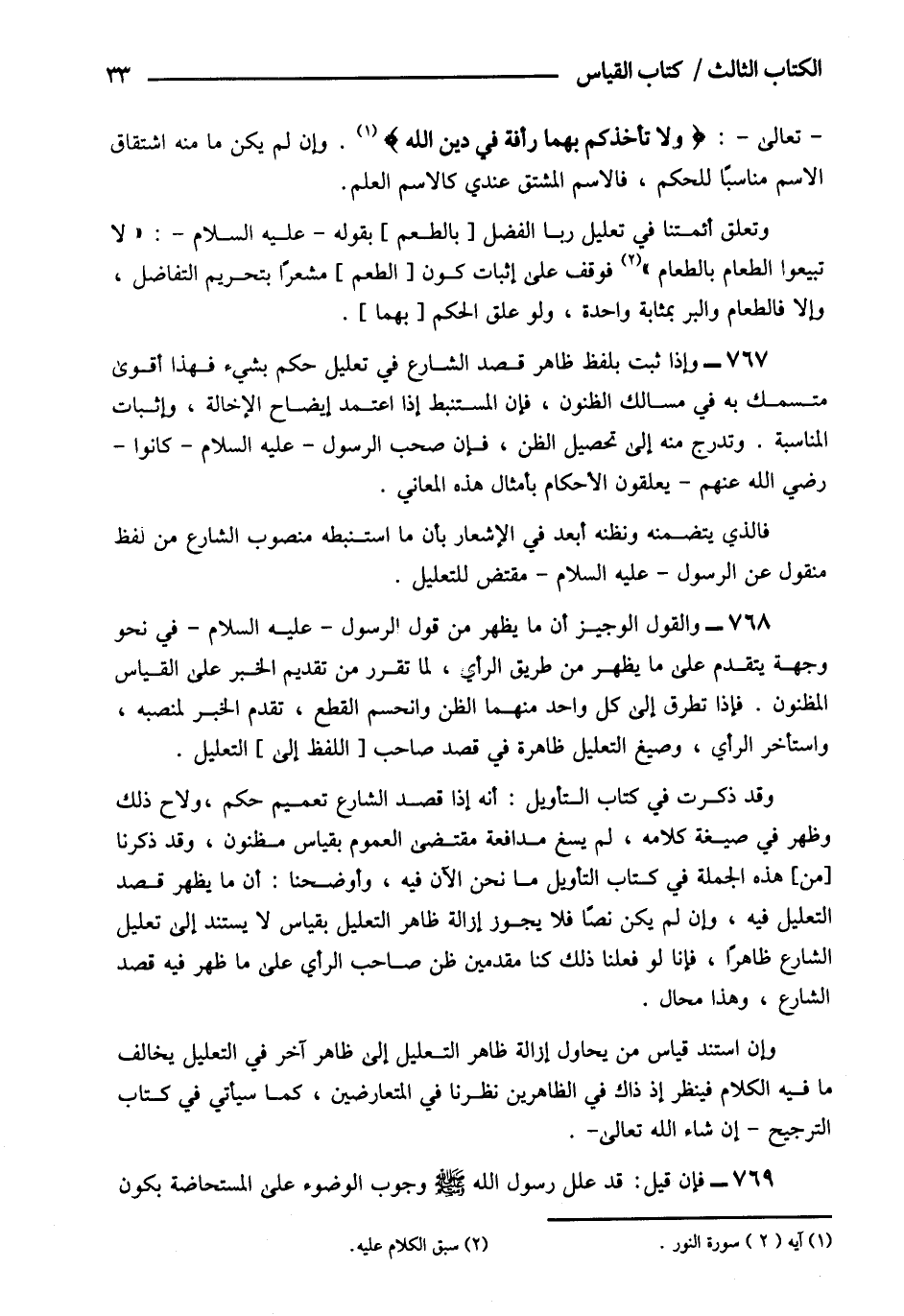 768- والقول الوجيز أن ما يظهر من قول الرسول عليه السلام في نحو وجهة يتقدم على ما يظهر من طريق الرأي لما تقرر من تقديم الخبر على القياس المظنون فإذا تطرق إلى كل واحد منهما الظن وانحسم القطع تقدم الخبر لمنصبه واستأخر الرأي وصيغ التعليل ظاهرة في قصد صاحب اللفظ إلى التعليل.