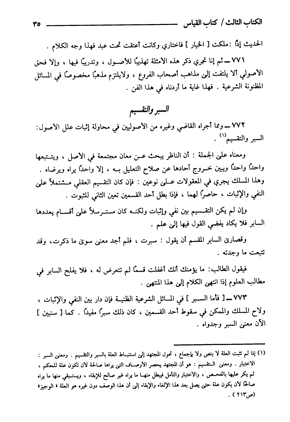 773-[فأما السبر] في المسائل الشرعية الظنية فإن دار بين النفى والإثبات ولاح المسلك الممكن في سقوط أحد القسمين كان ذلك سبرا مفيدا كما [سنبين] الآن معنى السبر وجدواه.