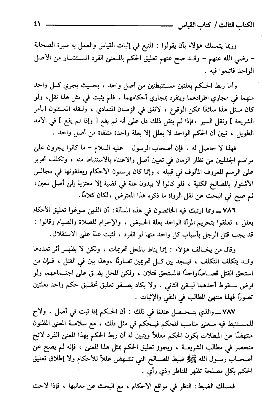 786- ومما ارتبك في الخائضون في هذه المسألة أن الذين سوغوا تعليق الأحكام بعلل تعلقوا بتحريم المرأة الواحدة بعلة الحيض والإحرام للصلاة والصيام وقالوا قد يجب قتل الرجل بأسباب كل واحد منها لو انفرد لثبت علة على الاستقلال.