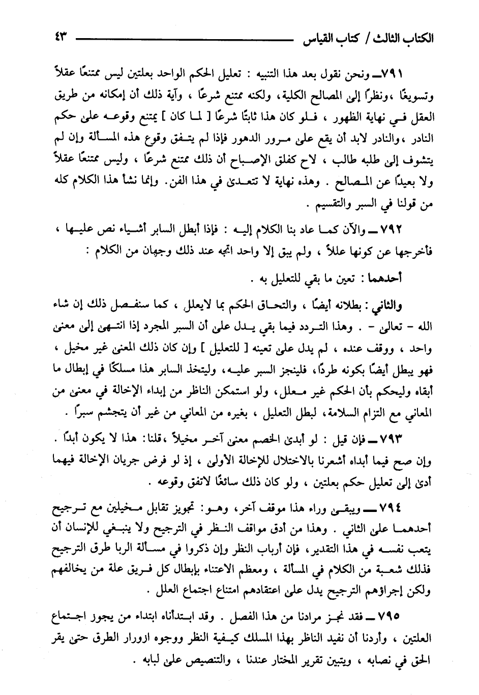 795- فقد نجز مرادنا من هذا الفصل وقد ابتدأناه ابتداء من يجوز اجتماع العلتين وأردنا أن نفيد الناظر بهذا المسلك كيفية النظر ووجوه ازورار الطرق حتى يقر الحق في نصابه ويتبين تقرير المختار عندنا والتنصيص على لبابه.