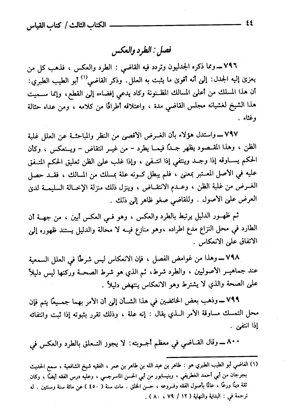 796- ومما ذكره الجدليون وتردد فيه القاضي الطرد والعكس فذهب كل من يعزي إليه الجدل إلى أنه أقوى ما يثبت به العلل وذكر القاضي1 أبو الطيب الطيري أن هذا المسلك من أعلى المسالك المظنونة وكاد يدعى إفضاءه إلى القطع وإنما سميت هذا الشيخ لغشيانه مجلس القاضي مدة واعتلاقه أطرافا من كلامه ومن عداه حثالة وغثاء.