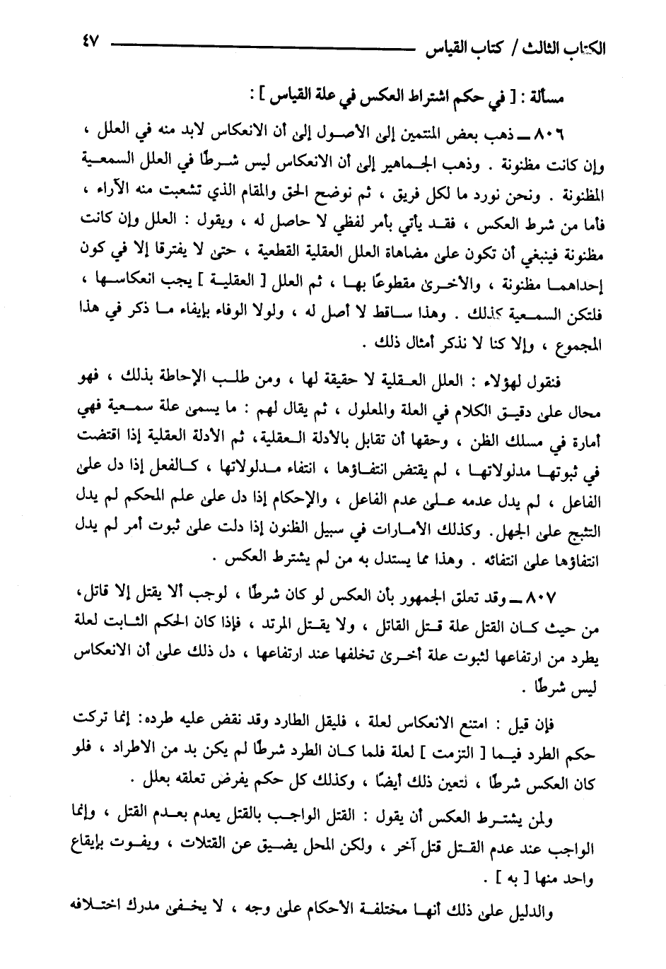 806- ذهب بعض المنتمين إلى الأصول إلى أن الانعكاس لا بد منه في العلل وإن كانت مظنونة وذهب الجماهير إلى أن الانعكاس ليس شرطا في العلل السمعية المظنونة ونحن نورد ما لكل فريق ثم نوضح الحق والمقام الذي تشعبت منه الاراء فأما من شرط العكس فقد يأتي بأمر لفظي لا حاصل له ويقول العلل وإن كانت مظنونة فينبعي أن تكون على مضاهاة العلل [العقلية] القطعية حتى لا يفترقا إلا في كون أحداهما مظنونة والآخرى مقطوعا بها ثم العلل العقلية يجب انعكاسها فلتكن السمعية كذلك وهذا ساقط لا أصل له ولولا الوفاء بإيفاء ما ذكر في هذا المجموع وإلا كنا لا نذكر أمثال ذلك.