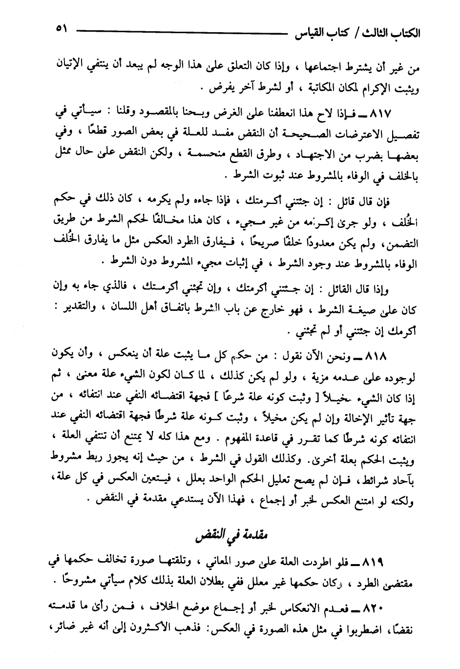 820- فعدم الانعكاس لخبر أو إجماع موضع الخلاف فمن رأى ما قدمته نقضا اضطربوا في مثل هذه الصورة في العكس فذهب الأكثرون إلى أنه غير ضائر.