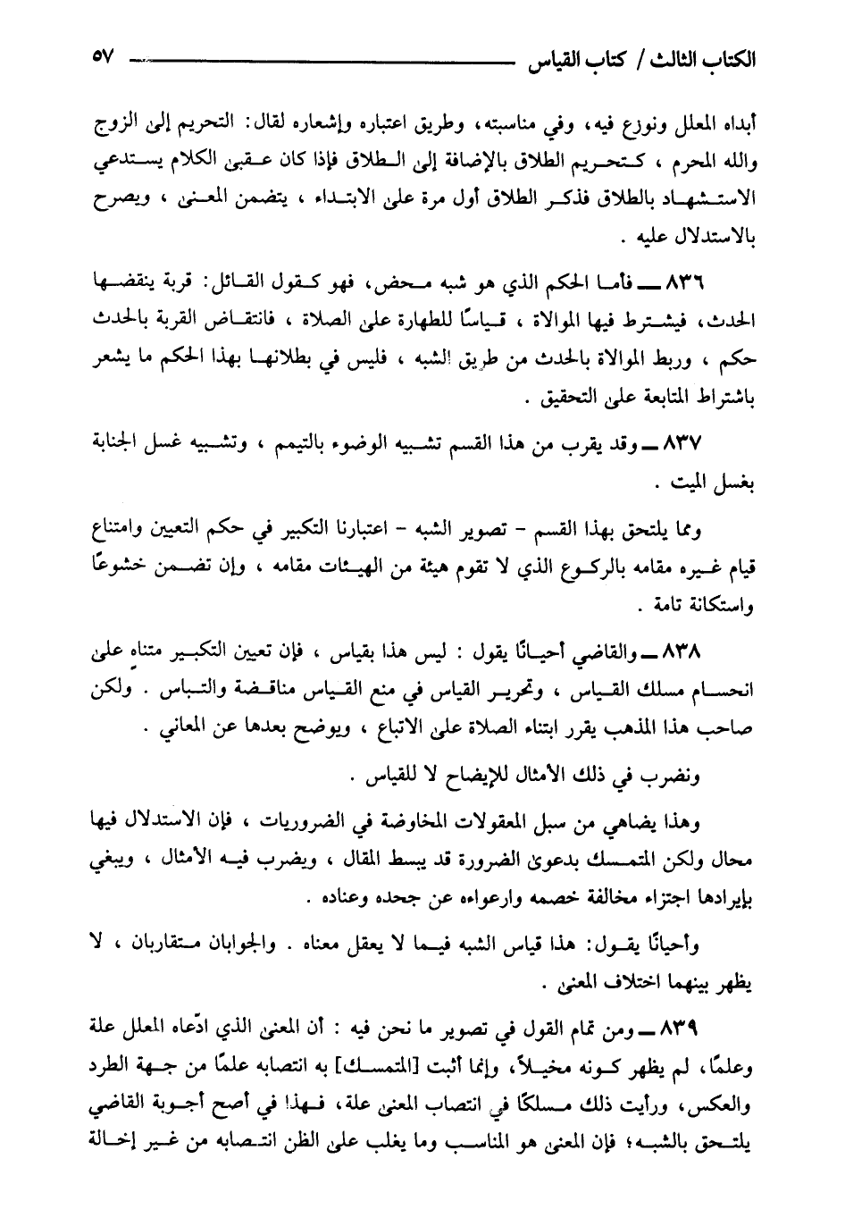 836- فأما الحكم الذي هو شبه محض فهو كقول القائل: قربة ينقضها الحدث فيشترط فيها الموالاة قياسا للطهارة على الصلاة فانتقاض القربة بالحدث حكم وربط الموالاة بالحدث من طريق الشبه فليس في بطلانها بهذا الحكم ما يشعر باشتراط المتابعة على التحقيق.
