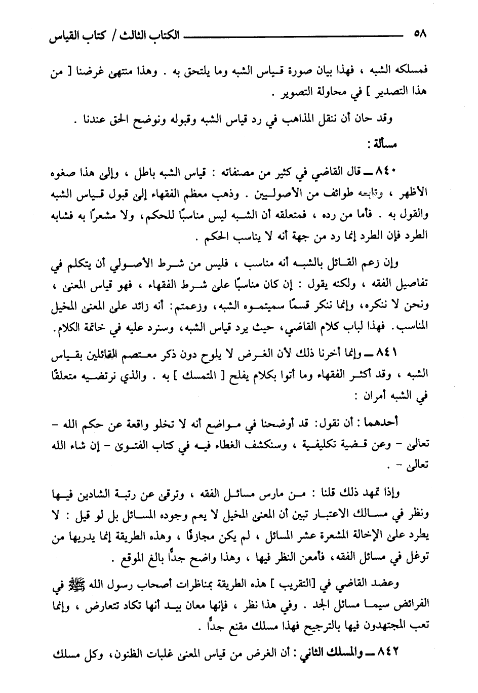841- وإنما أخرنا ذلك لأن الغرض لا يلوح دون ذكر معتصم القائلين بقياس الشبه وقد أكثر الفقهاء وما أتوا بكلام يفلح [المتمسك] به والذي نرتضيه متعلقا في الشبه أمران.