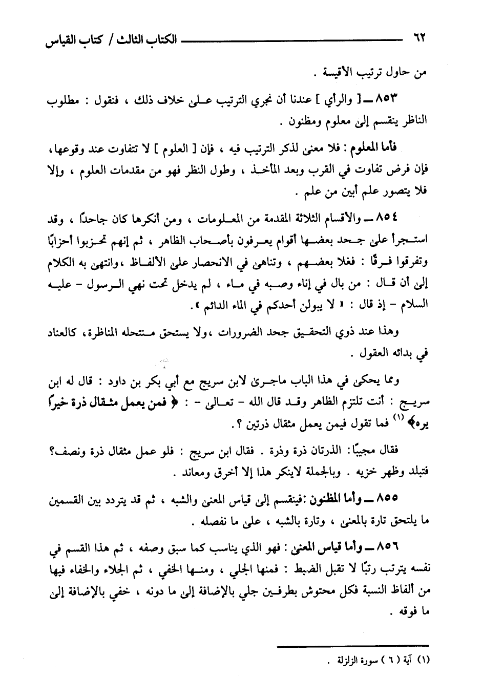 - 854 والأقسام الثلاثة المقدمة من المعلومات ومن أنكرها كان جاحدا وقد استجرأ على جحد بعضها أقوام يعرفون بأصحاب الظاهر ثم إنهم تحزبوا أحزابا وتفرقوا فرقا فغلا بعضهم وتناهى في الانحصار على الألفاظ وانتهى به الكلام إلى أن قال: من بال في إناء وصبه في ماء لم يدخل تحت نهى الرسول عليه السلام إذ قال: "لا يبولن أحدكم في الماء الدائم".