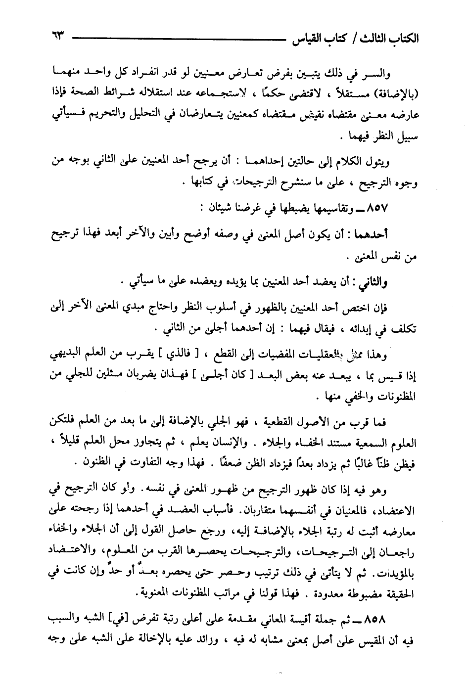 858- ثم جمله أقيسة المعاني مقدمة على أعلى رتبة تفرض [في] الشبه والسبب فيه أن المقيس على أصل بمعنى مشابه له فيه وزائد عليه بالإخالة على الشبه على وجه.