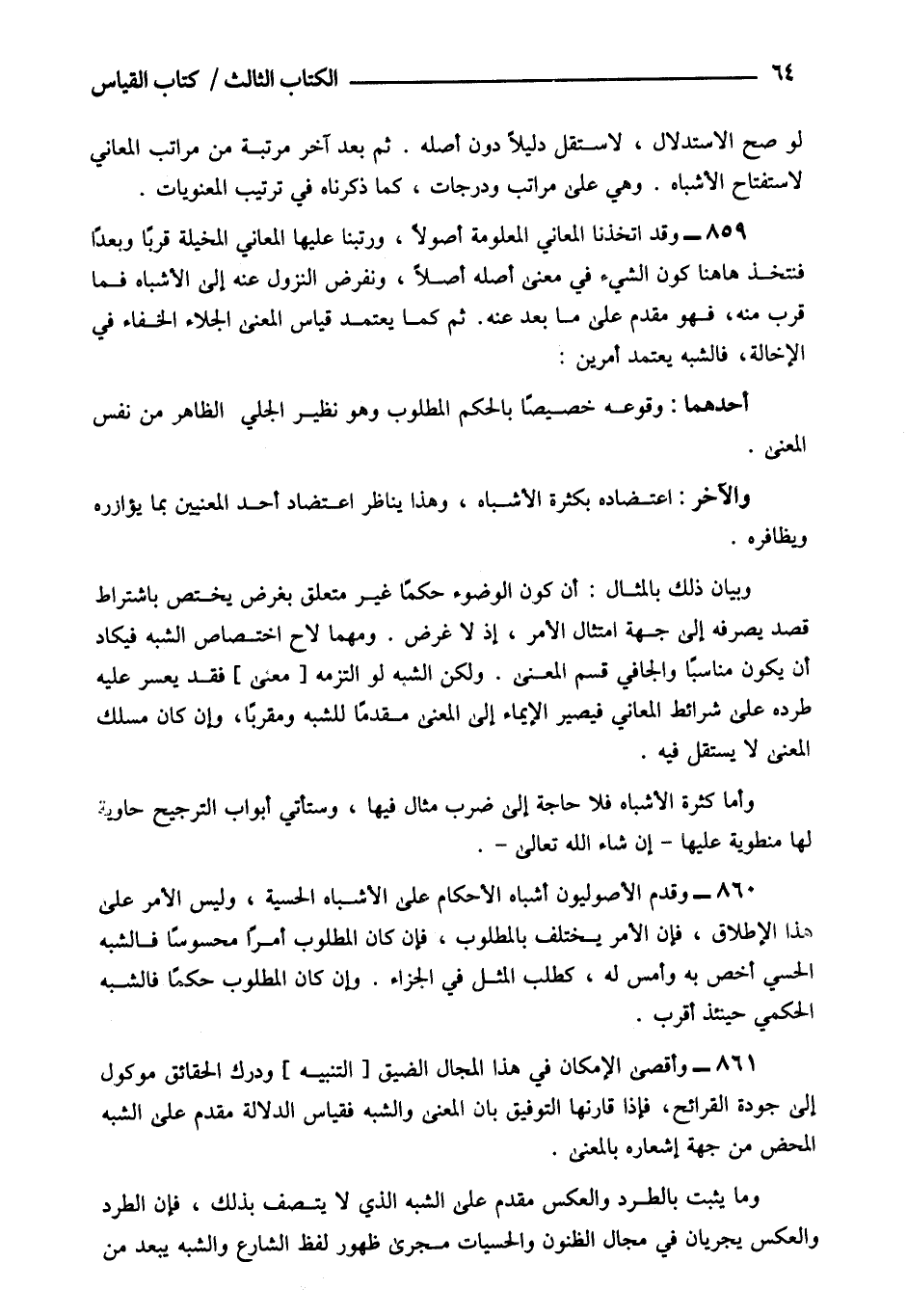 860- وقدم الأصوليون أشباه الأحكام على الأشباه الحسية وليس الأمر على هذا الإطلاق فأن الأمر يختلف بالمطلوب فإن كان المطلوب أمرا محسوسا فالشبه الحسي أخص به وأمس له كطلب المثل في الجزاء وإن كان المطلوب حكما فالشبه الحكمي حينئذ أقرب.