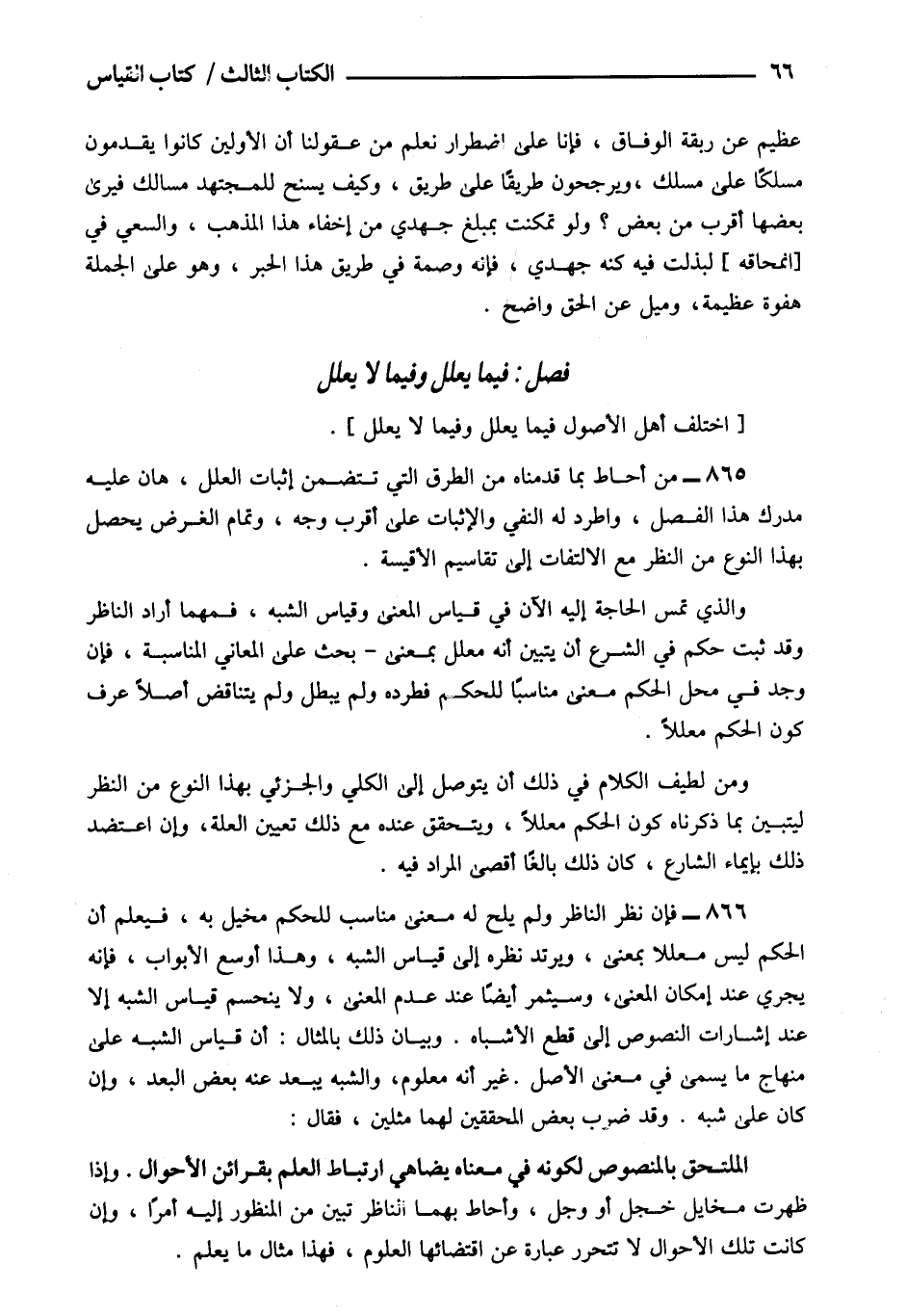 865- من أحاط بما قدمناه من الطرق التي تتضمن إثبات العلل هان عليه مدرك هذا الفصل واطرد له النفى والإثبات على أقرب وجه وتمام الغرض يحصل بهذا النوع من النظر مع الالتفات إلى تقاسيم الأقيسة.