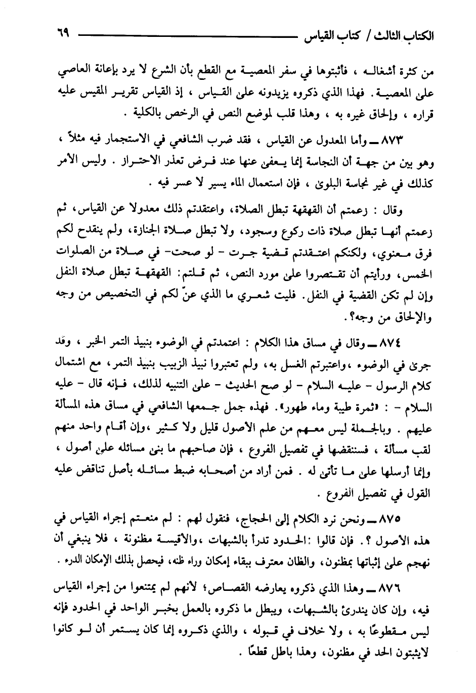 874- وقال في مساق هذا الكلام: اعتمدتم في الوضوء بنبيذ التمر الخبر وقد جرى في الوضوء واعتبرتم الغسل به ولم تعتبروا نبيذ الزبيب بنبيذ التمر مع اشتمال كلام الرسول عليه السلام لو صح الحديث على التنبيه لذلك فإنه قال عليه السلام: "ثمرة طيبة وماء طهور"، فهذه جمل جمعها الشافعي في مساق هذه المسألة عليهم وبالجملة ليس معهم من علم الأصول قليل ولا كثير وإن أقام واحد منهم لقب مسألة فسننقضها في تفصيل الفروع فإن صاحبهم ما بنى مسائله على أصول وإنما أرسلها على ما تأتي له فمن أراد من أصحابه ضبط مسائله بأصل تناقض عليه القول في تفصيل الفروع.
