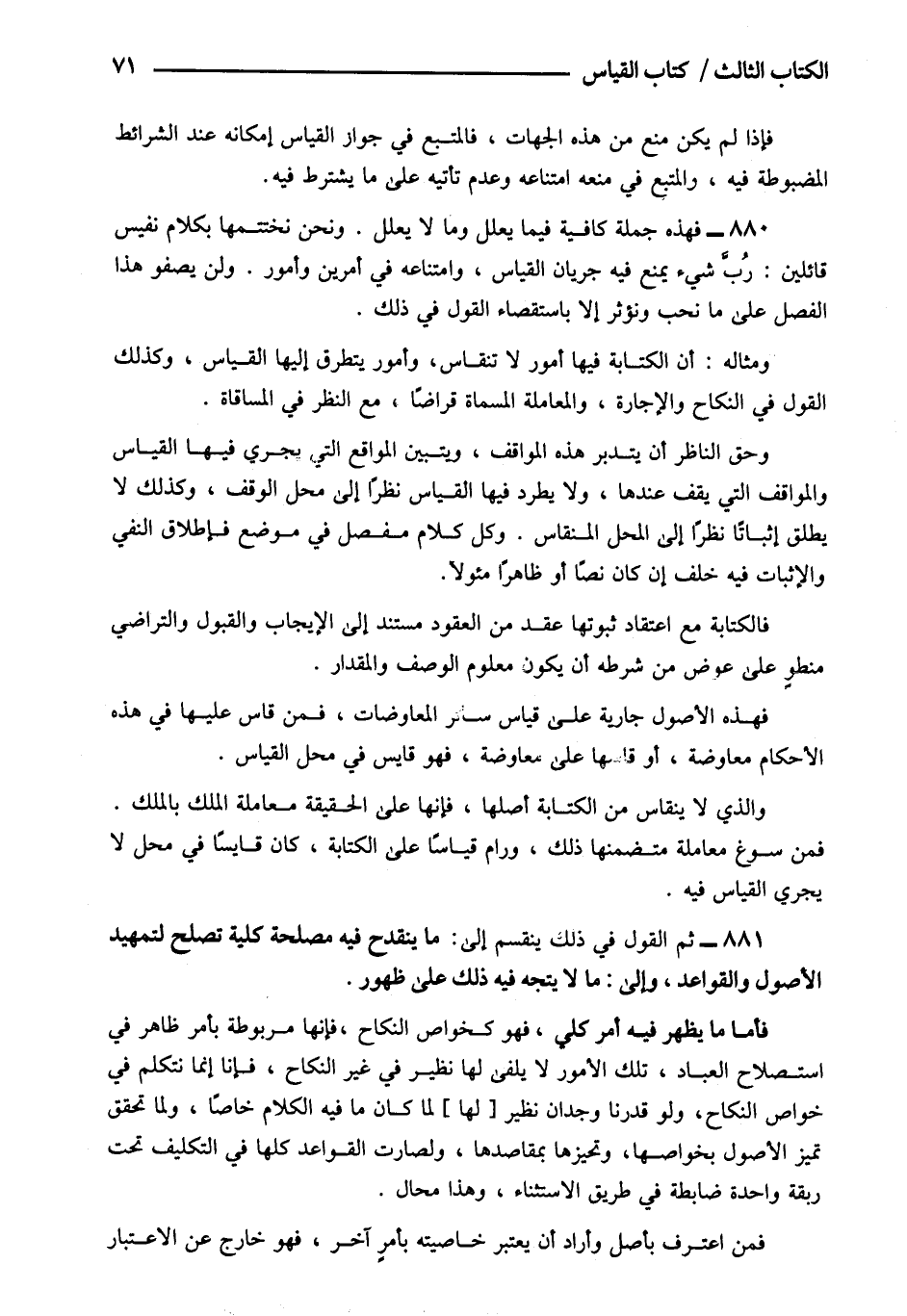 880- فهذه جملة كافية فيما يعلل وما لا يعلل ونحن نختتمها بكلام نفيس قائلين: رب شيء يمنع فيه جريان القياس وامتناعه في أمرين وأمور ولن يصفو هذا الفصل على ما نحب ونؤثر إلا باستقصاء القول في ذلك.