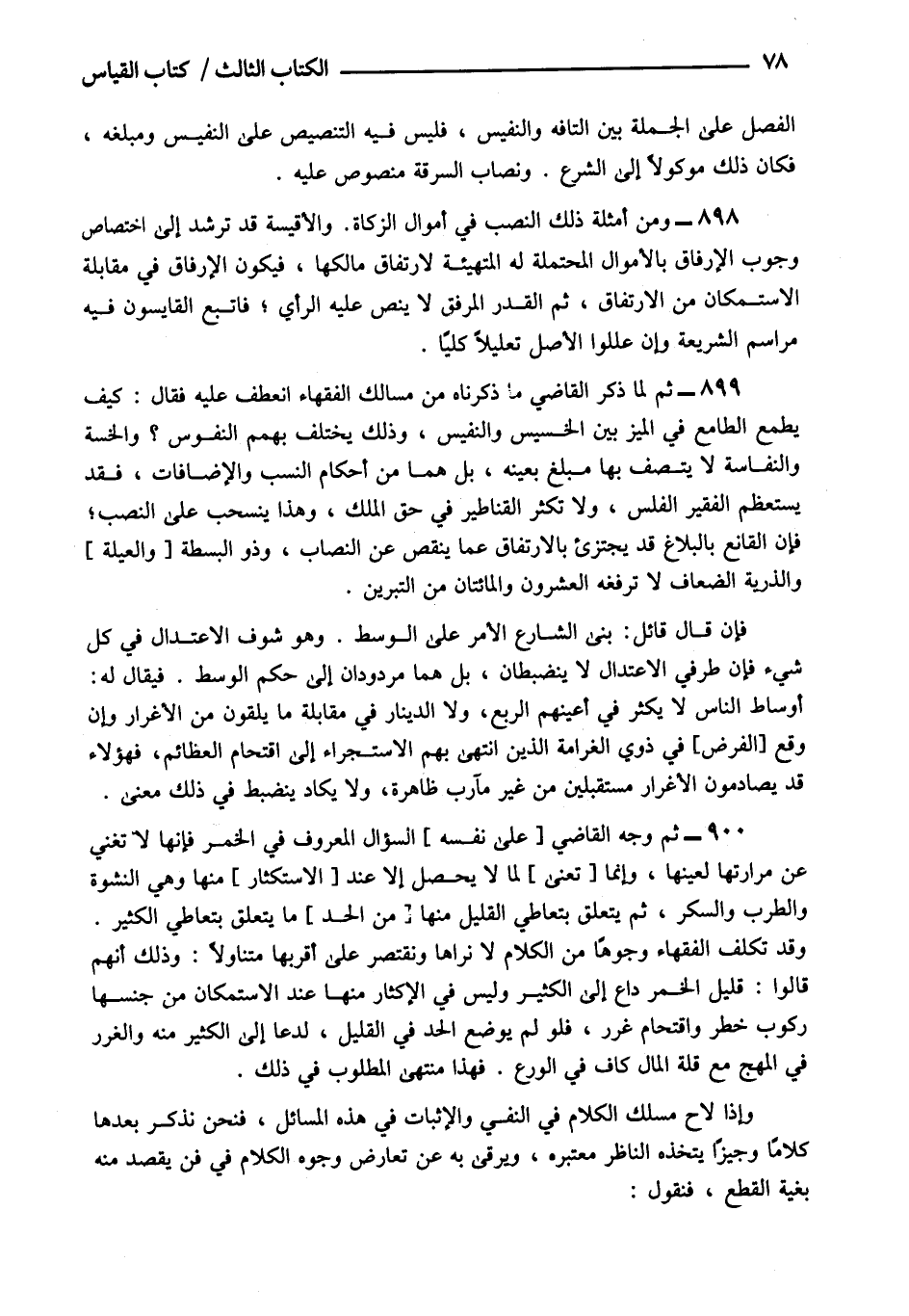 898- ومن أمثلة ذلك النصب في أموال الزكاة والأقيسة قد ترشد إلى اختصاص وجوب الإرفاق بالأموال المحتملة له المتهيئة لارتفاق مالكها فيكون الإرفاق في مقابلة الاستمكان من الارتفاق ثم القدر المرفق لا ينص عليه الرأي فاتبع القايسون فيه مراسم الشريعة وإن عللوا الأصل تعليلا كليا.
