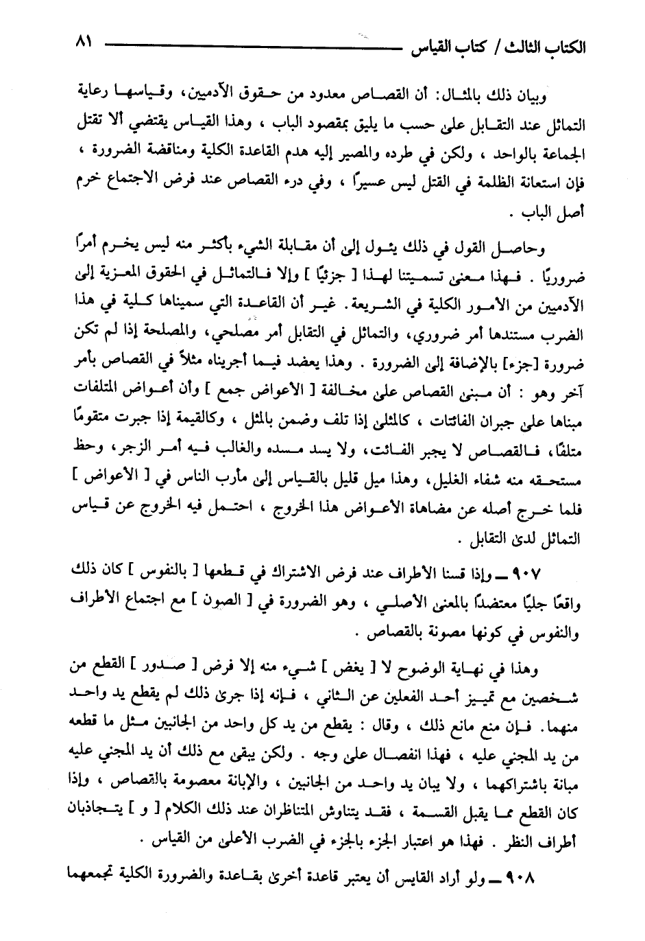907- وإذا قسنا الأطراف عند فرض الاشتراك في قطعها بالنفوس كان ذلك واقعا جليا معتضدا بالمعنى الأصلي وهو الضرورة في الصون مع اجتماع الأطراف والنفوس في كونها مصونة بالقصاص.