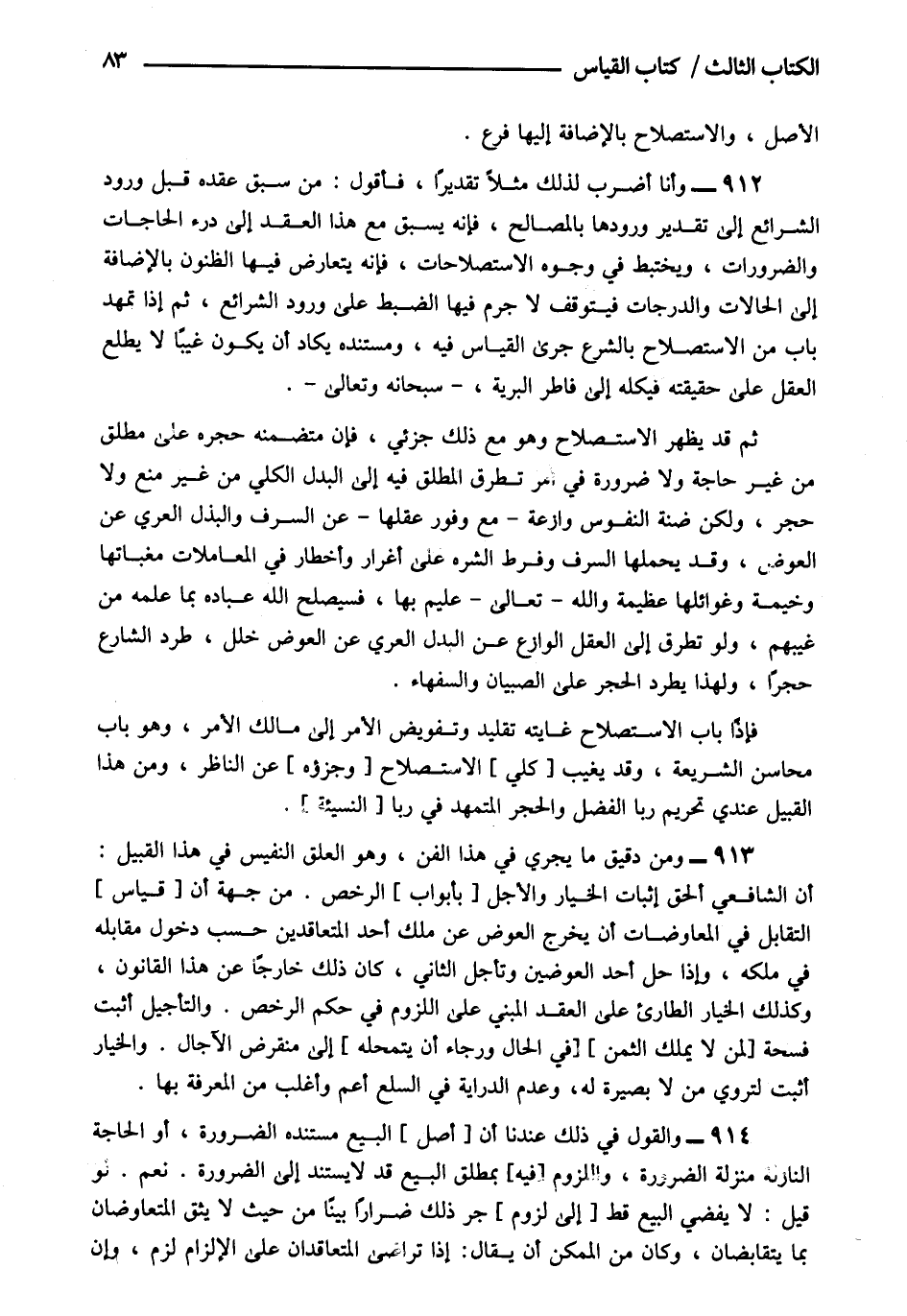 فإذا باب الاستصلاح غايته تقليد وتفويض الأمر إلى مالك الأمر وهو باب محاسن الشريعة وقد يعيب [كلى] الاستصلاح [وجزؤه] عن الناظر ومن هذا القبيل عندي تحريم ربا الفضل والحجر المتمهد في ربا [النسيئة] .