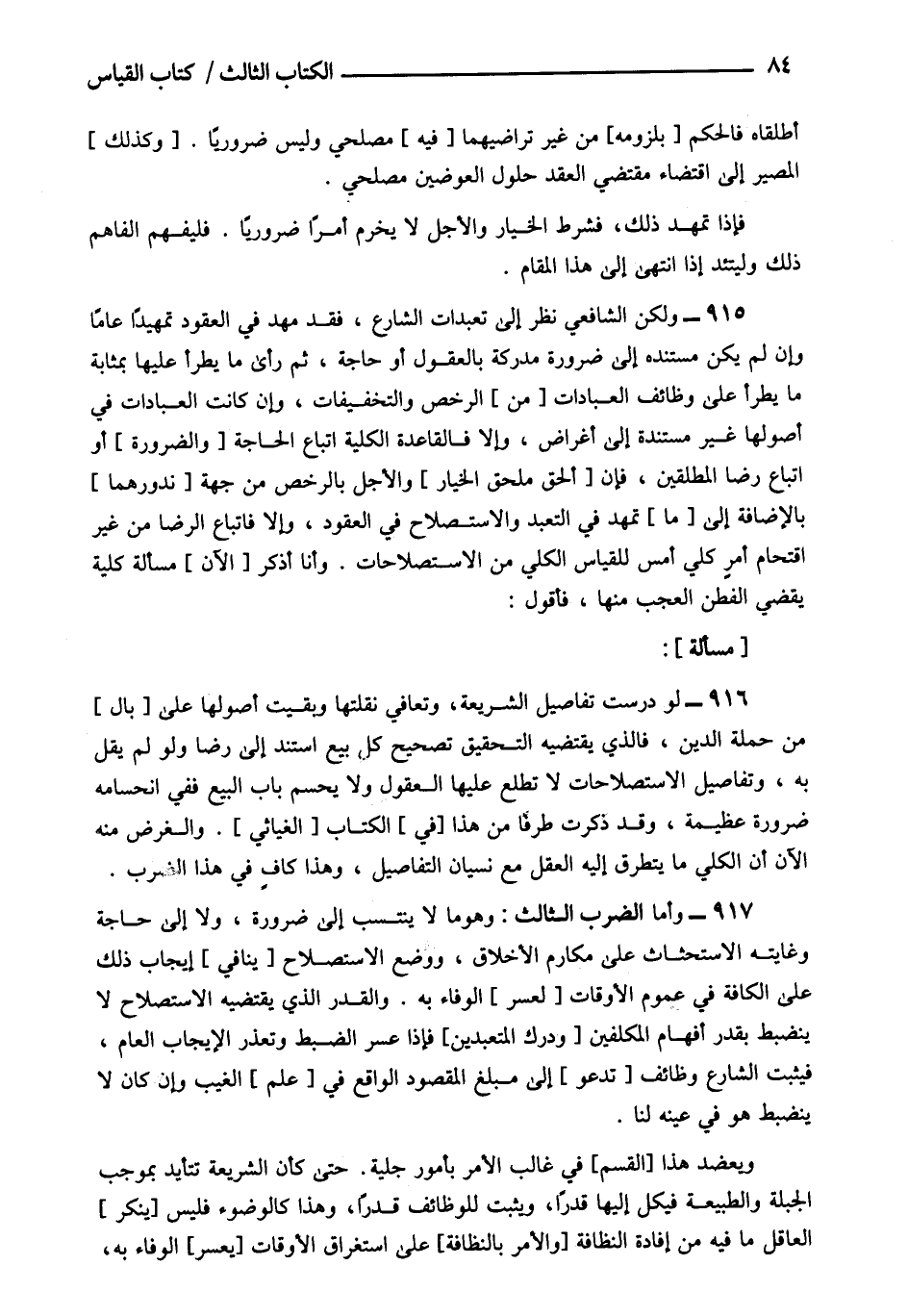 915- ولكن الشافعي نظر إلى تعبدات الشارع فقد مهد في العقود تمهيدا عاما وإن لم يكن مستنده إلى ضرورة مدركة بالعقول أو حاجة ثم رأى ما يطرأ عليها بمثابة ما يطرأ على وظائف العبادات [من] الرخص والتخفيفات وإن كانت العبادات في أصولها غير مستندة إلى أغراض وإلا فالقاعدة الكلية اتباع الحاجة [والضرورة] أو أتباع رضا المطلقين فإن [ألحق ملحق الخيار] والأجل بالرخص من جهة [ندورهما] بالإضافة إلى [ما] تمهد في التعبد والاستصلاح في العقود وإلا فاتباع الرضا من غير اقتحام أمر كلي أمس للقياس الكلي من الاستصلاحات وأنا أذكر [الآن] مسألة كلية يقضى الفطن العجب منها فأقول.