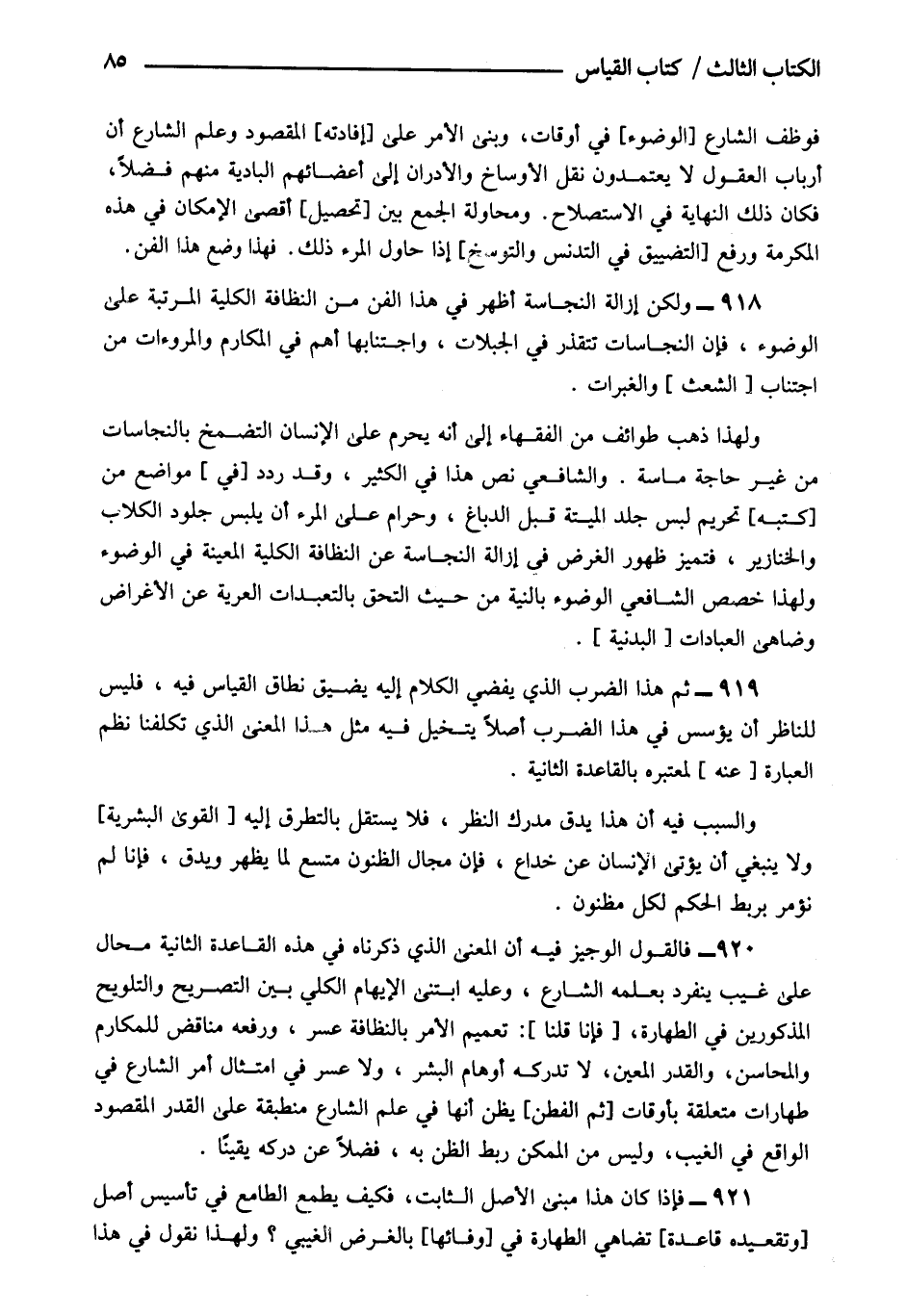 920- فالقول الوجيز فيه أن المعنى الذي ذكرناه في هذه القاعدة الثانية محال على غيب ينفرد بعلمه الشارع وعليه ابتني الإيهام الكلى بين التصريح والتلويح المذكورين في الطهارة [فإنا قلنا] تعميم الأمر بالنظافة عسر ورفعه مناقض للمكارم والمحاسن والقدر المعين لا تدركه أوهام البشر ولا عسر في امتثال أمر الشارع في طهارات متعلقة بأوقات [ثم الفطن] يظن أنها في علم الشارع منطبقة على القدر المقصود الواقع في الغيب وليس من الممكن ربط الظن به فضلا عن دركه يقينا.