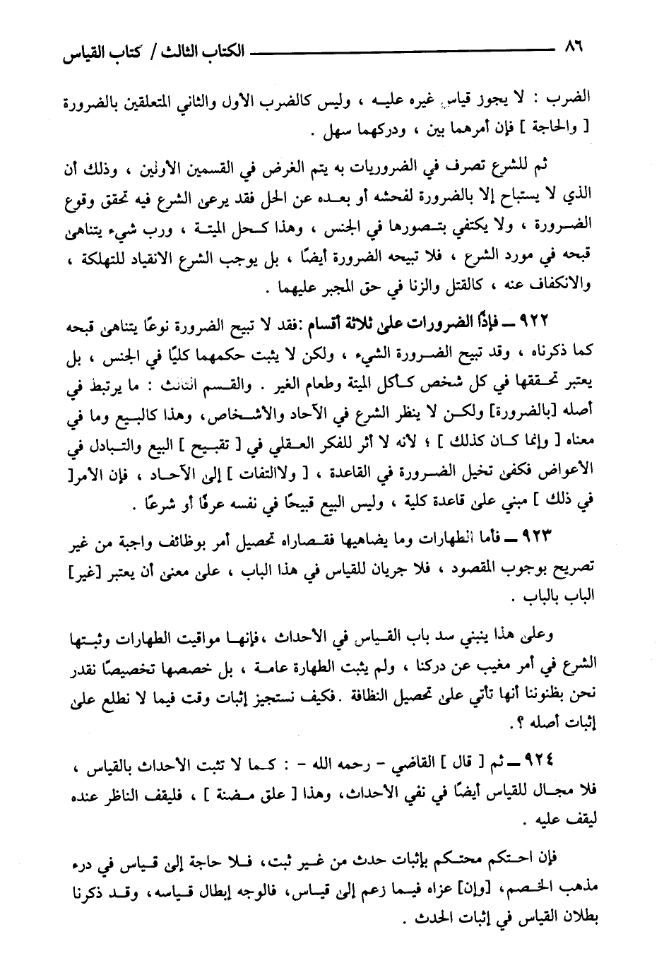 923- فأما الطهارات وما يضاهيها فقصاراه تحصيل أمر بوظائف واجبة من غير تصريح بوجوب المقصود فلا جريان للقياس في هذا الباب على معنى أن يعتبر غير الباب بالباب.