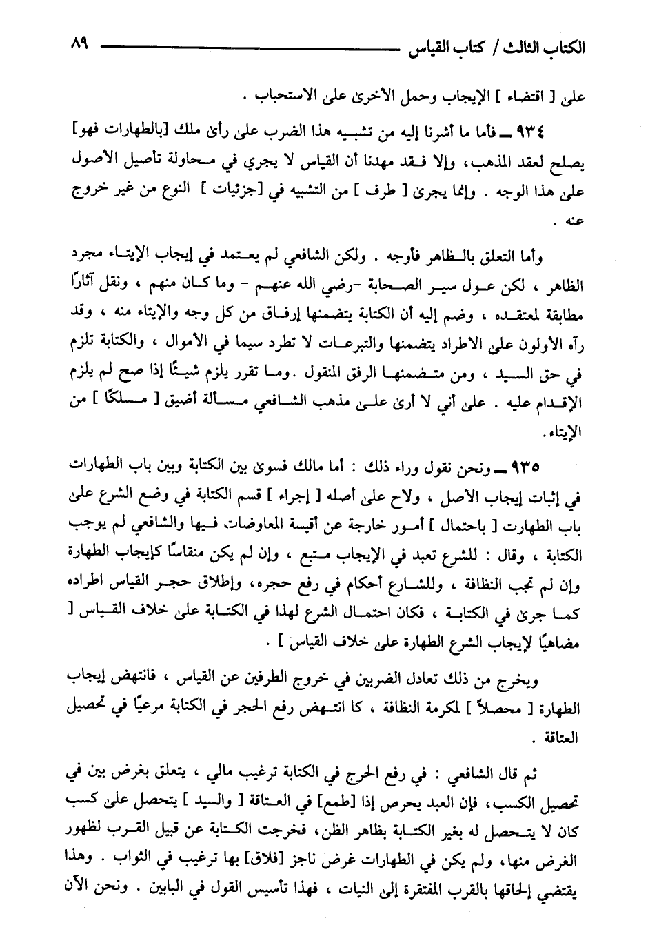 935- ونحن نقول وراء ذلك: أما مالك فسوى بين الكتابة وبين باب الطهارات في إثبات إيجاب الأصل ولاح على أصله [إجراء] قسم الكتابة في وضع الشرع على باب الطهارات [باحتمال] أمور خارجة عن أقيسة المعاوضات فيها والشافعي لم يوجب الكتابة وقال للشرع تعبد في الإيجاب متبع وإن لم يكن منقاسا كإيجاب الطهارة وإن لم تجب النظافة وللشارع أحكام في رفع حجره وإطلاق حجر القياس اطراده كما جرى في الكتابة فكان احتمال الشرع لهذا في الكتابة على خلاف القياس [مضاهيا لإيجاب الشرع الطهارة على خلاف القياس] .