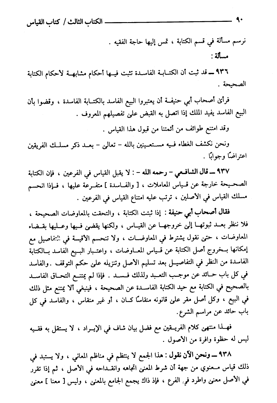 937- قال الشافعي رحمه الله: لا يقبل القياس في الفرعين فان الكتابة الصحيحة خارجة عن قياس المعاملات [والفاسدة] متفرعة عليها فإذا انحسم مسلك القياس في الأصلين ترتب عليه امتناع القياس في الفرعين.