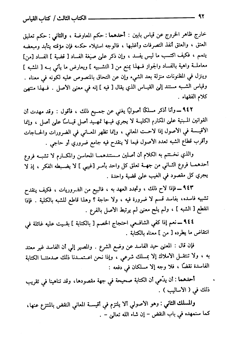942- وأنا أذكر مسلكا أصوليا يغنى عن جميع ذلك فأقول: وقد مهدت أن القوانين المبنية على المكارم الكلية لا يجرى فيها تمهيد أصل قياسا على أصل وإنما الأقيسة في الأصول إذا لاحت المعاني وإنما تظهر المعاني في الضرورات والحاجات وأقرب قطاع الشبه تعدد الأصول فيما لا ينقدح فيه جامع ضروري أو حاجى.