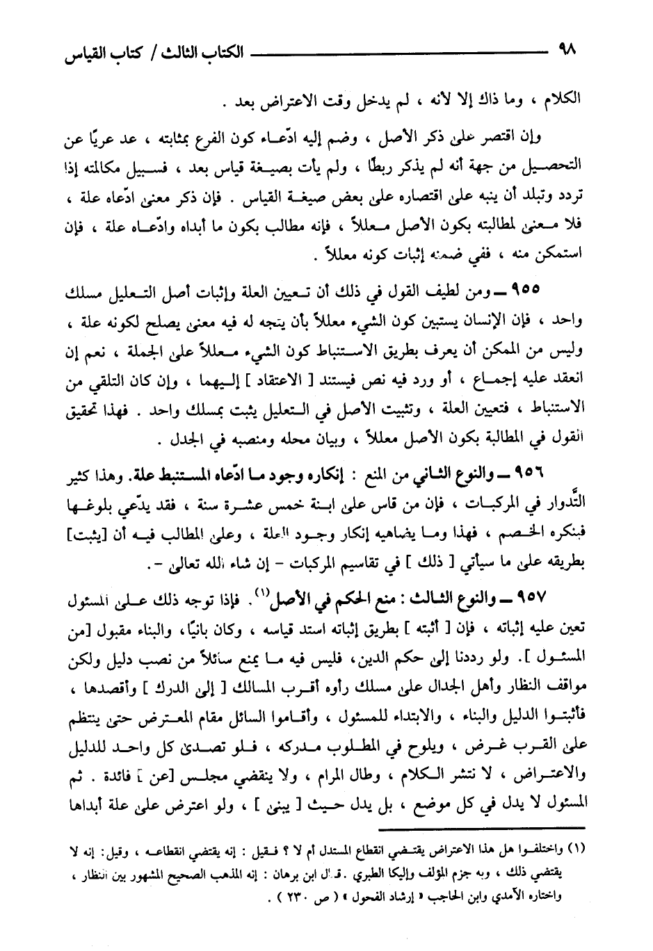 956- والنوع الثاني من المنع: إنكار وجود ما ادعاه المستنبط علة وهذا كثير التدوار في المركبات فإن من قاس على انبة خمس عشرة سنة فقد يدعى بلوغها فينكره الخصم فهذا وما يضاهيه إنكار وجود العلة وعلى المطالب فيه أن [يثبت] بطريقة على ما سيأتي [ذلك] في تقاسيم المركبات إن شاء الله تعالى.